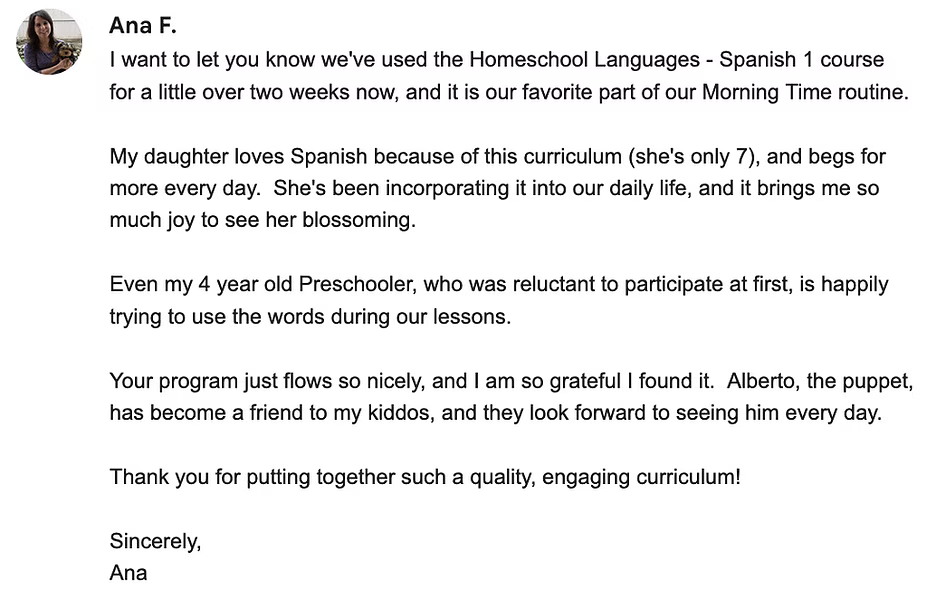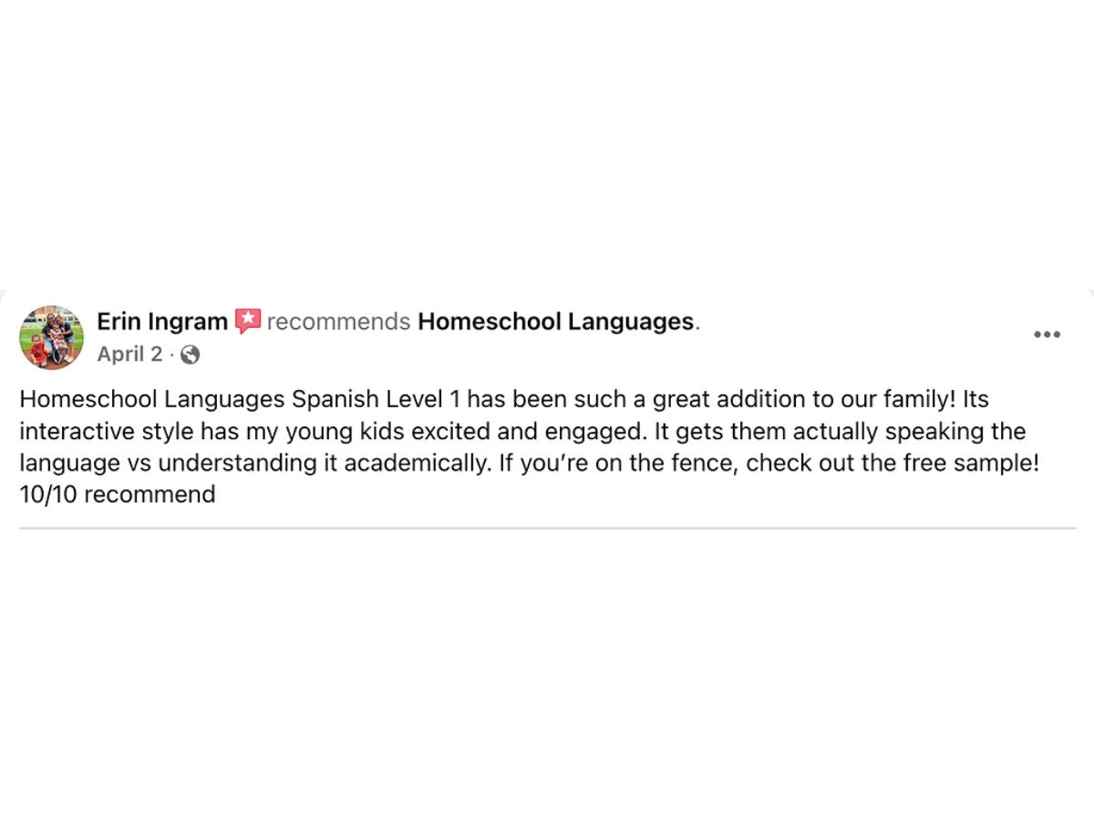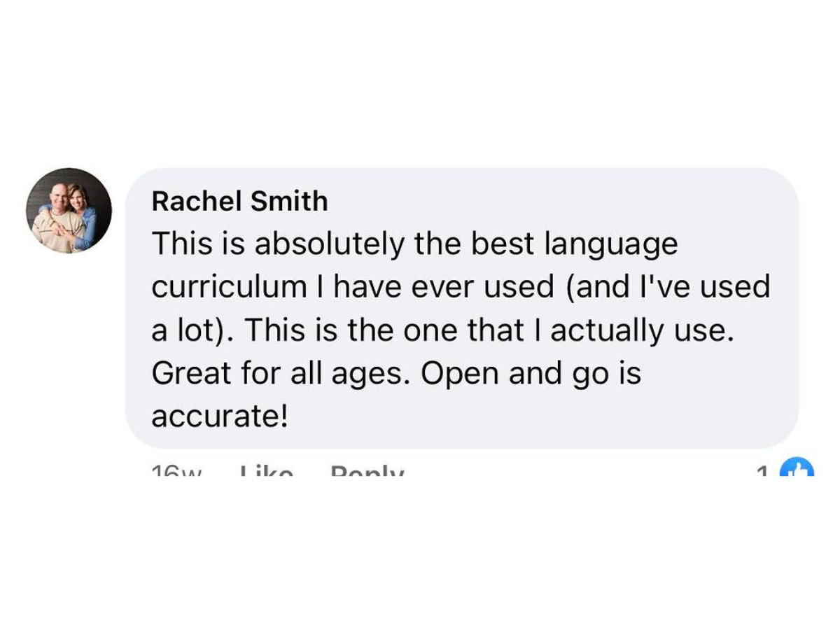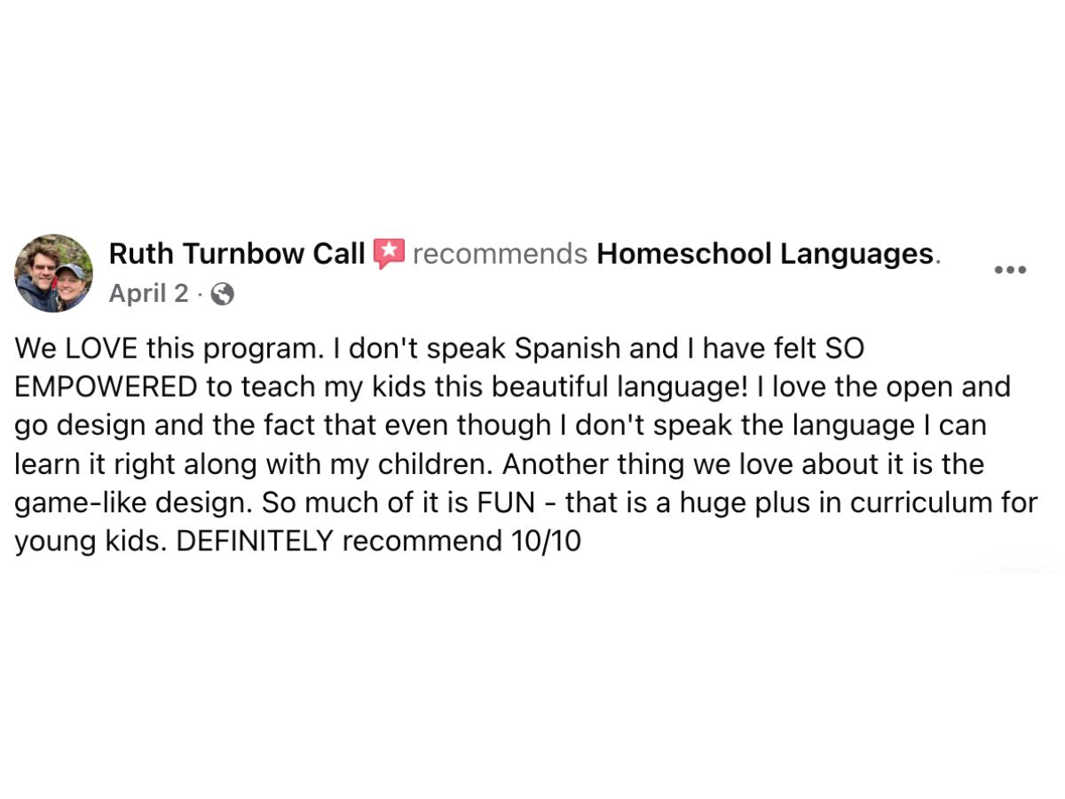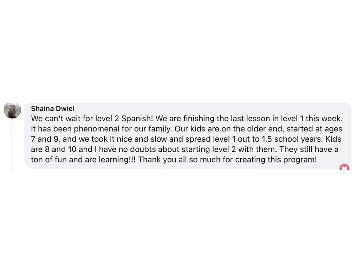 → Homeschool Languages is geared toward kids ages 4-10! Ask about it in our Facebook group though, a lot of families report their tag-along younger children picking up on the language, as well as older teens loving it because there's a strong foundation of the language involved.