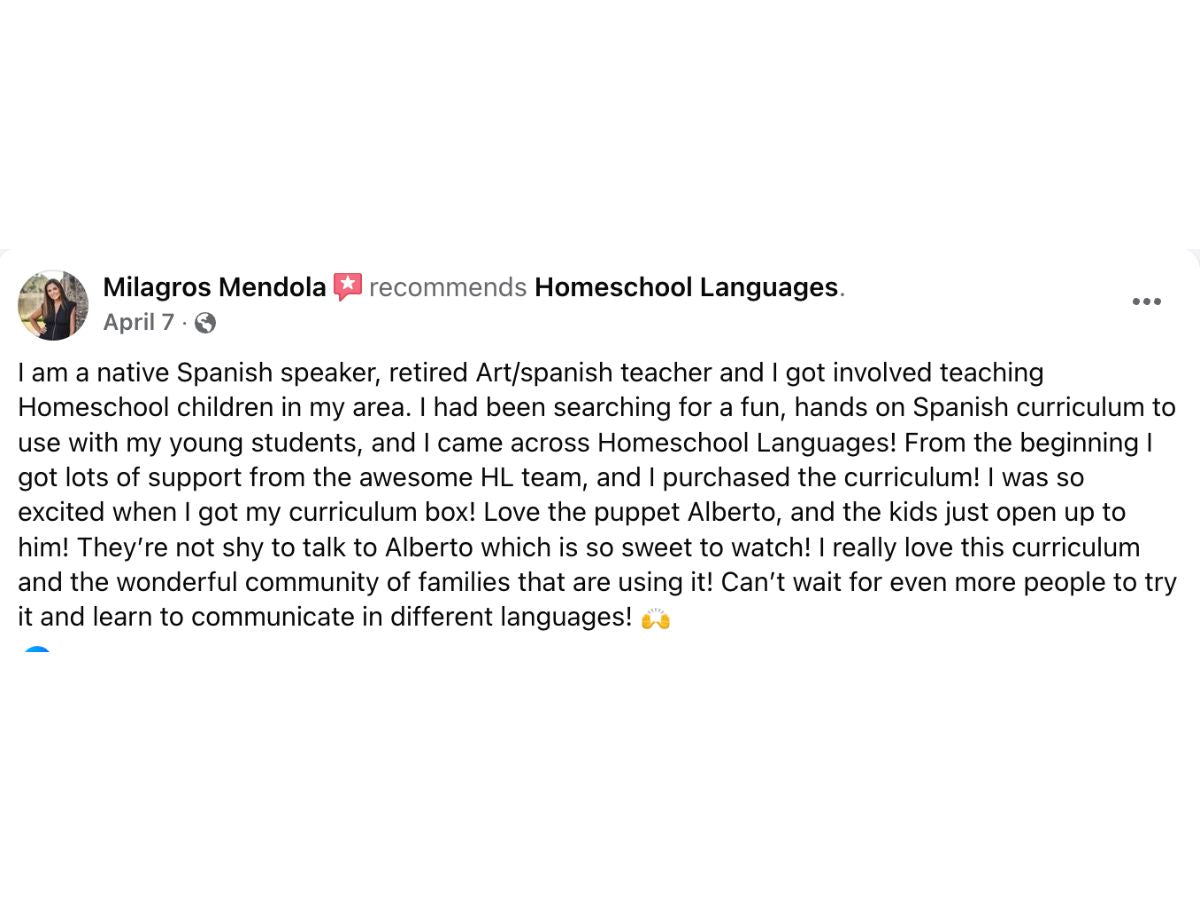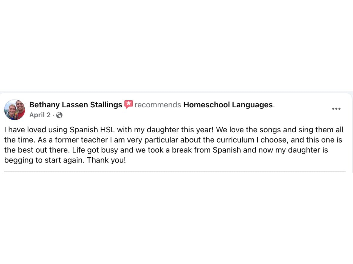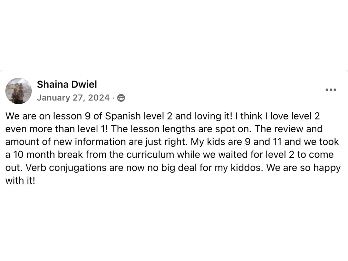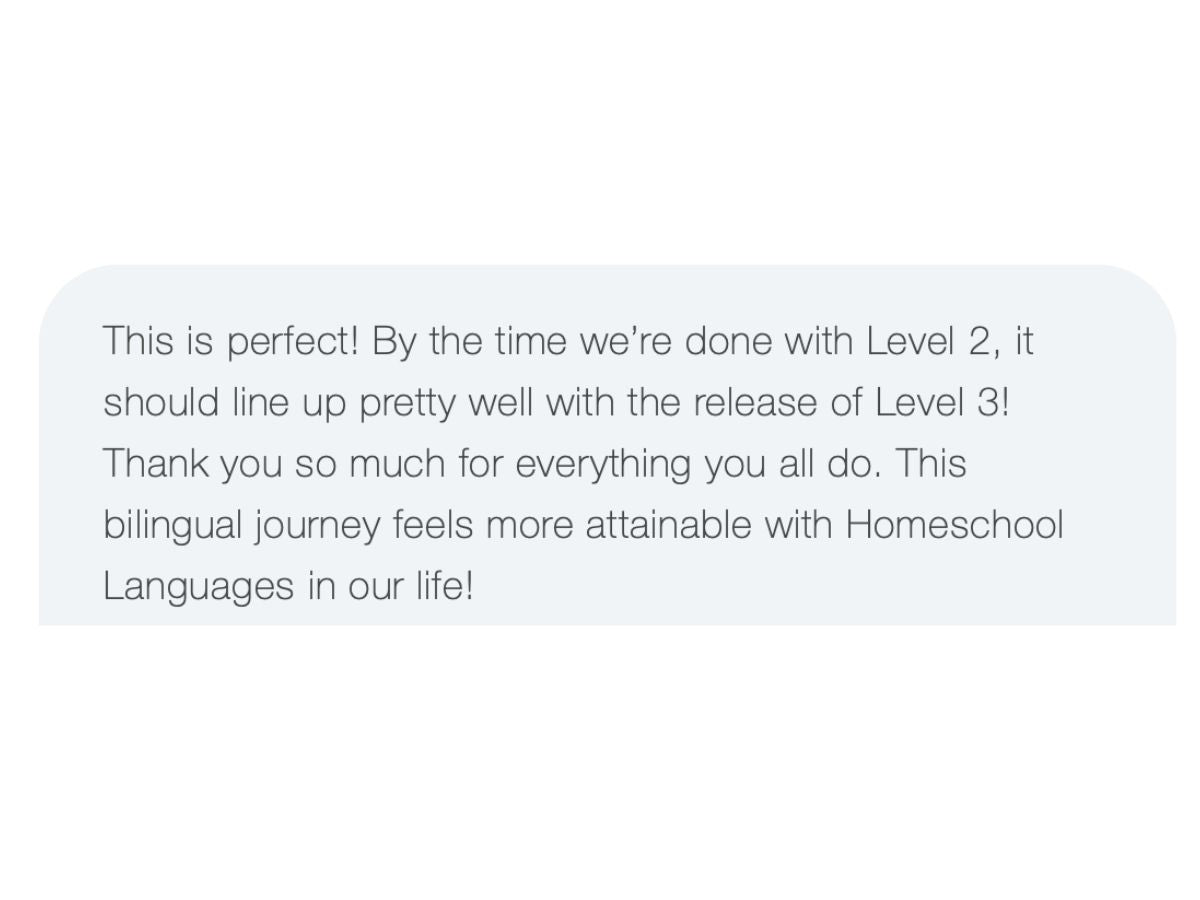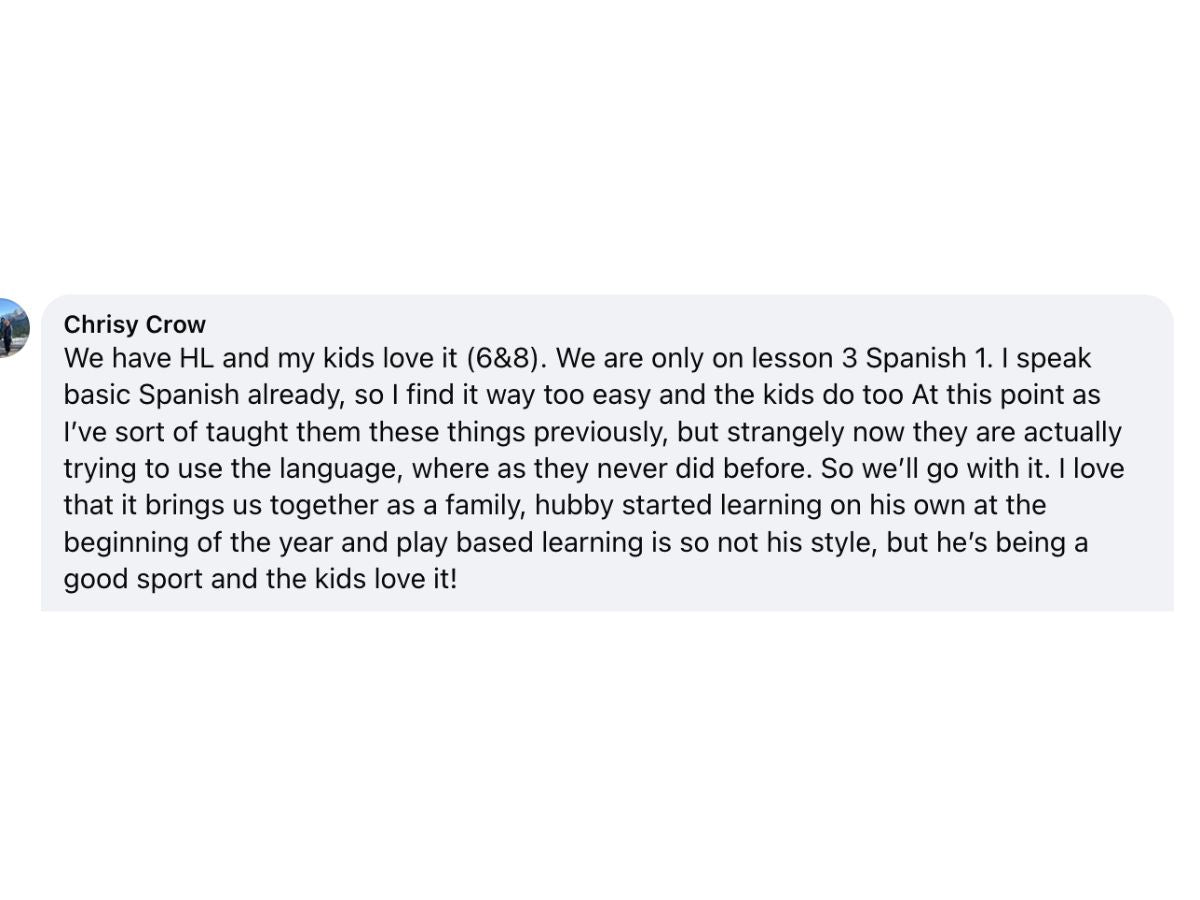 → Homeschool Languages is geared toward kids ages 4-10! Ask about it in our Facebook group though, a lot of families report their tag-along younger children picking up on the language, as well as older teens loving it because there's a strong foundation of the language involved.