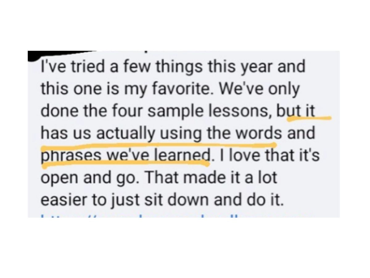 Instead of guessing, print and try the first 10 lessons of ANY of our languages (and everything you'll need to complete them!) for free. You'll be amazed how quickly language fills your home!