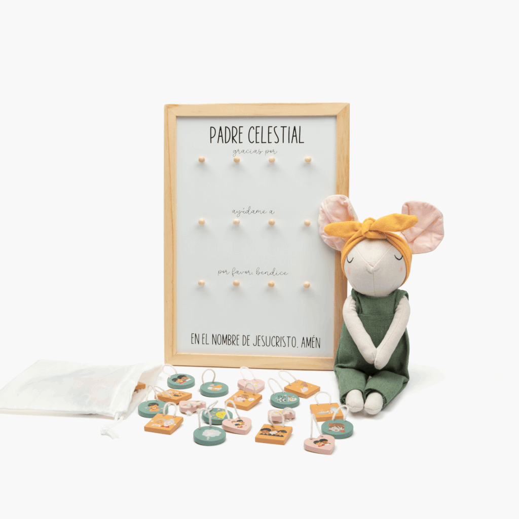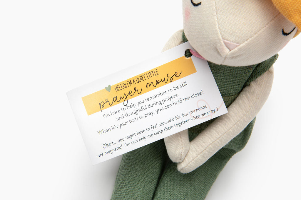 🧸 Prayer Mouse (physical version only) – A soft, lovable stuffed mouse with magnetic hands that model reverence and help guide your child through prayer time.