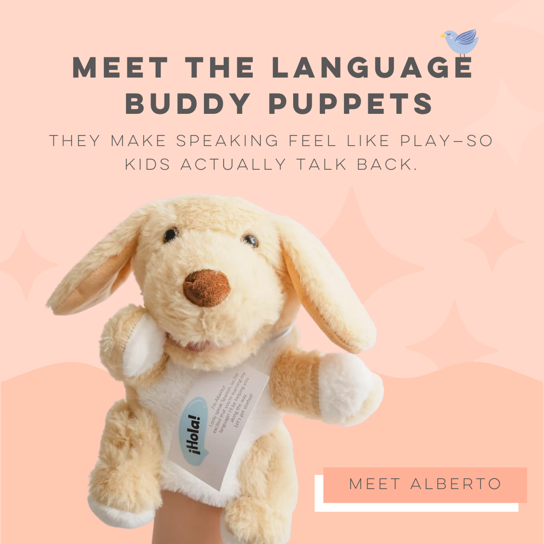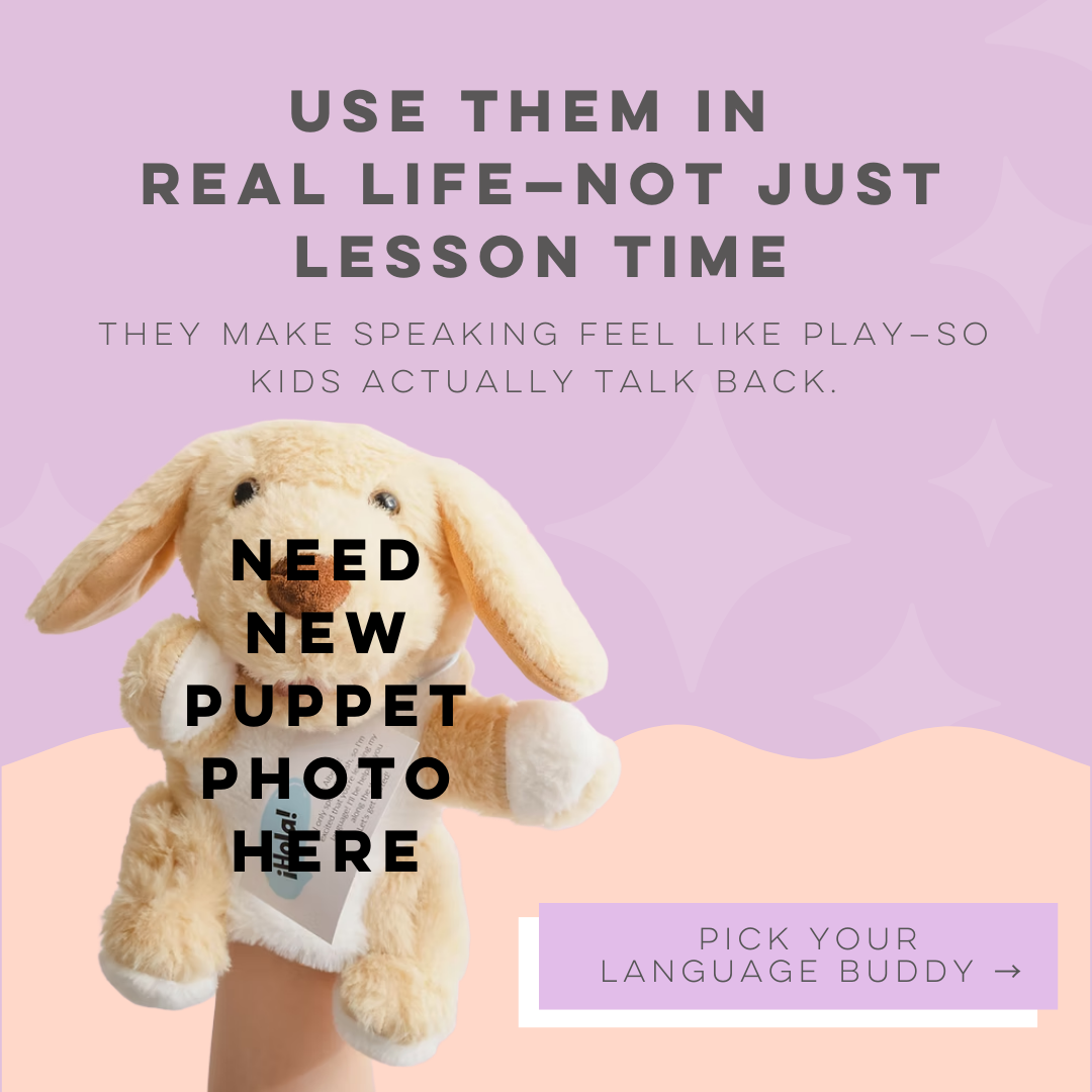 Here’s the magic: your puppet friend only understands the target language—so your child has a real reason to use the words. Kids naturally repeat phrases, finish sentences, and start speaking back because it feels like play… not a lesson
